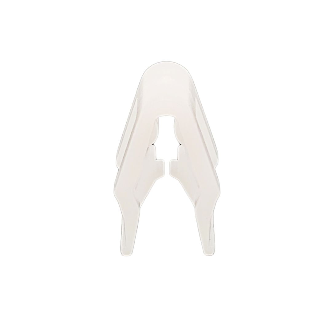 These small, white plastic clips are designed to securely fasten trim pieces and fascia covers in place. They attach to a lug on the trim, which is then inserted into a hole, where the clip clicks into place to hold the trim securely. These clips are prone to breaking during removal or if the trim is impacted.