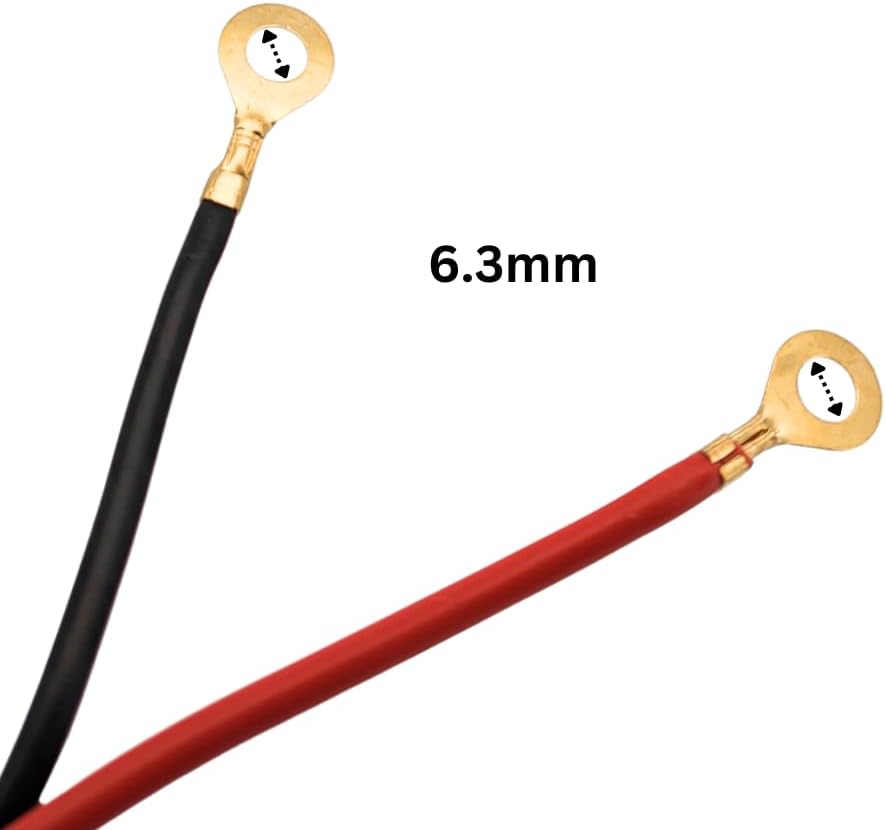 - Featuring an eyelet terminal with an inner diameter of 6.3mm, the red wire connects to the positive terminal, while the black wire connects to the negative (-) or ground (GND) terminal, ensuring ease of use and installation.