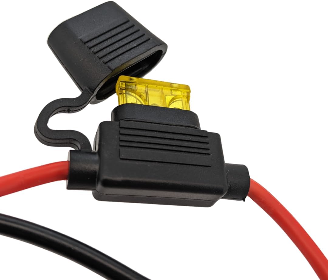 - Input: Operating at a voltage range of DC12V-24V, this device provides an output of 12V-24V DC with a current rating of 20A. The cable length extends to 1 meter and features heavy-duty 2.5mm² (approximately 13 AWG) 14AWG wiring, capable of supporting the high current of 20A. Additionally, the fuse box comes equipped with a built-in 20A fuse.