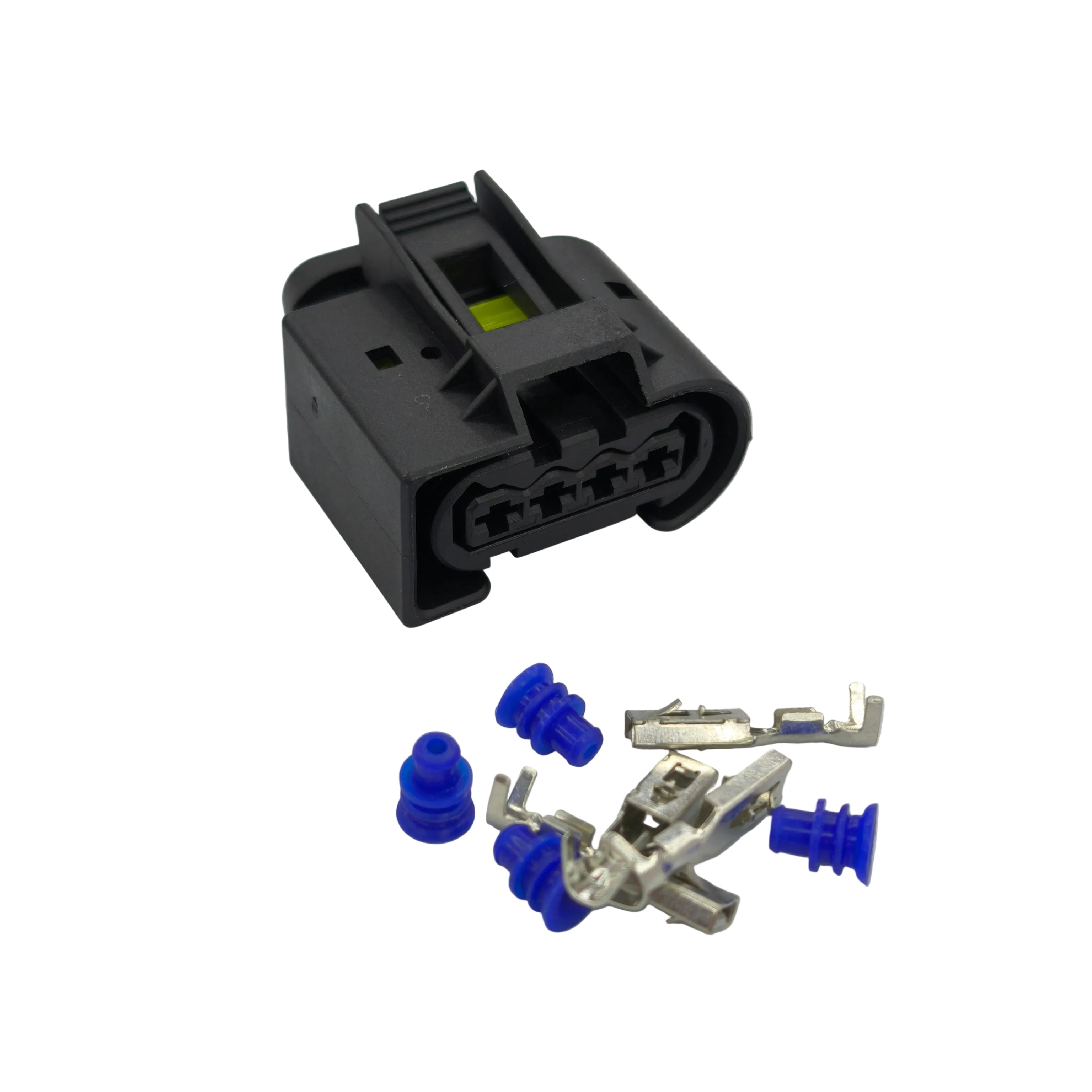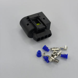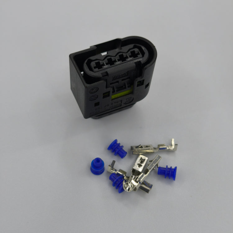 Replacement 4 way connector plug kit with a female housing design, ideal for restoring a secure and reliable electrical connection on compatible automotive wiring harness applications.