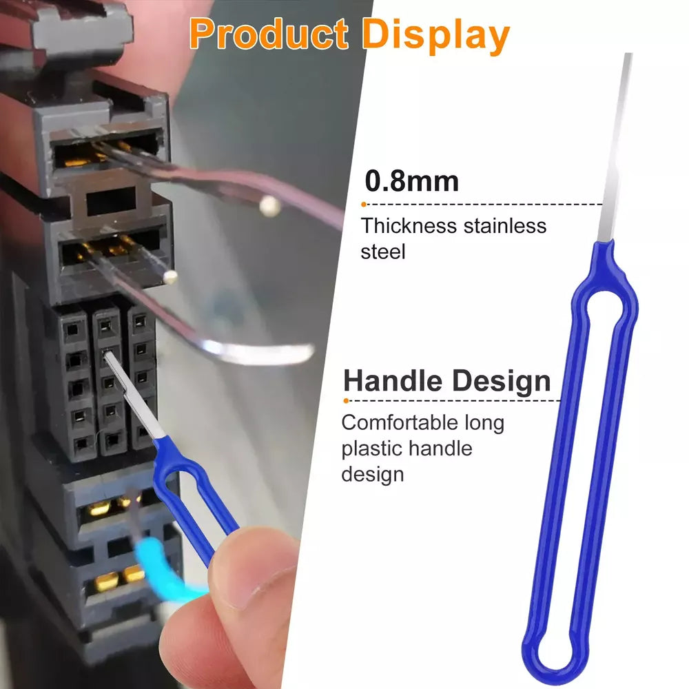Enhanced Terminal Removal Tool: Upgraded to a sturdy 1mm thickness, our tool is significantly stronger than standard 0.6mm versions, reducing the risk of bending or breaking. The extended handle design ensures a secure, comfortable grip for effortless operation.
