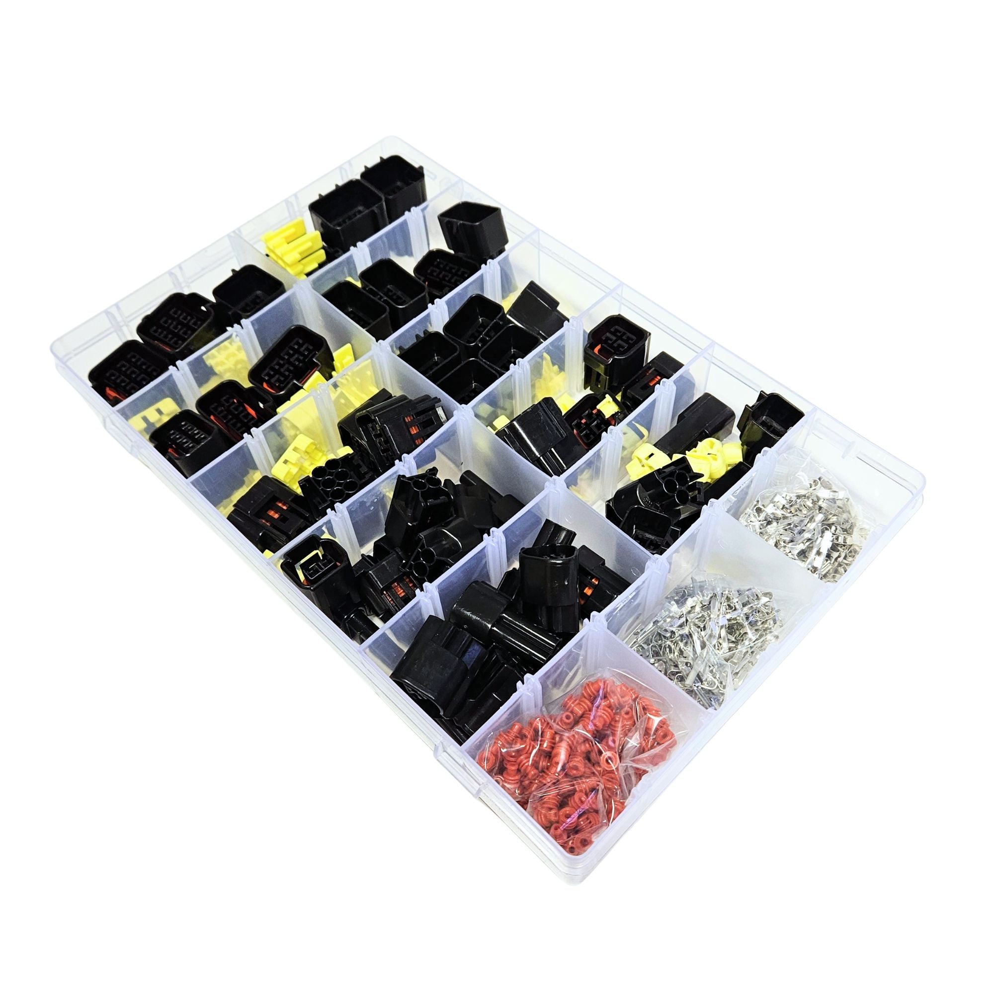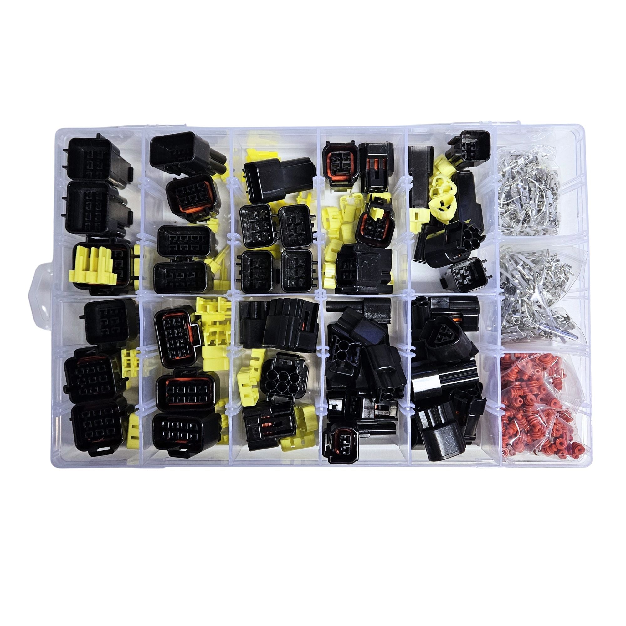 This 2.3 Series FW-C waterproof connector kit is a comprehensive assortment of male and female automotive connectors, ideal for electrical repairs, wiring looms, and custom harness builds. Designed for durability and reliability, these connectors provide a secure, weather-resistant connection suitable for demanding automotive environments.