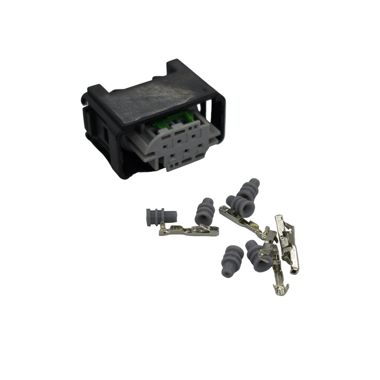 Replacement 6 pin accelerator pedal wiring connector plug designed to restore a secure and reliable electrical connection on compatible wiring harness applications. Ideal for repairs where the original plug is damaged, loose, or has broken locking tabs.