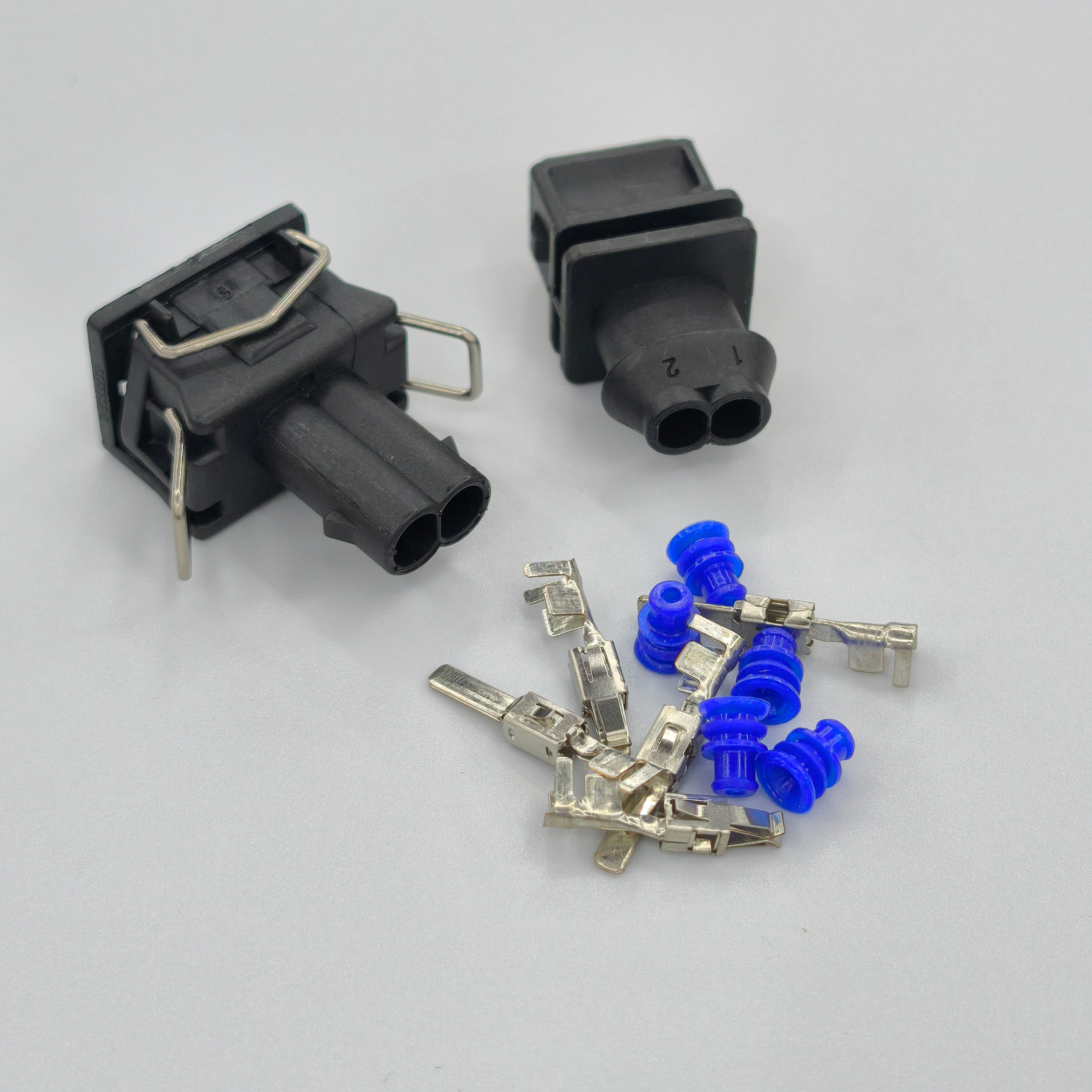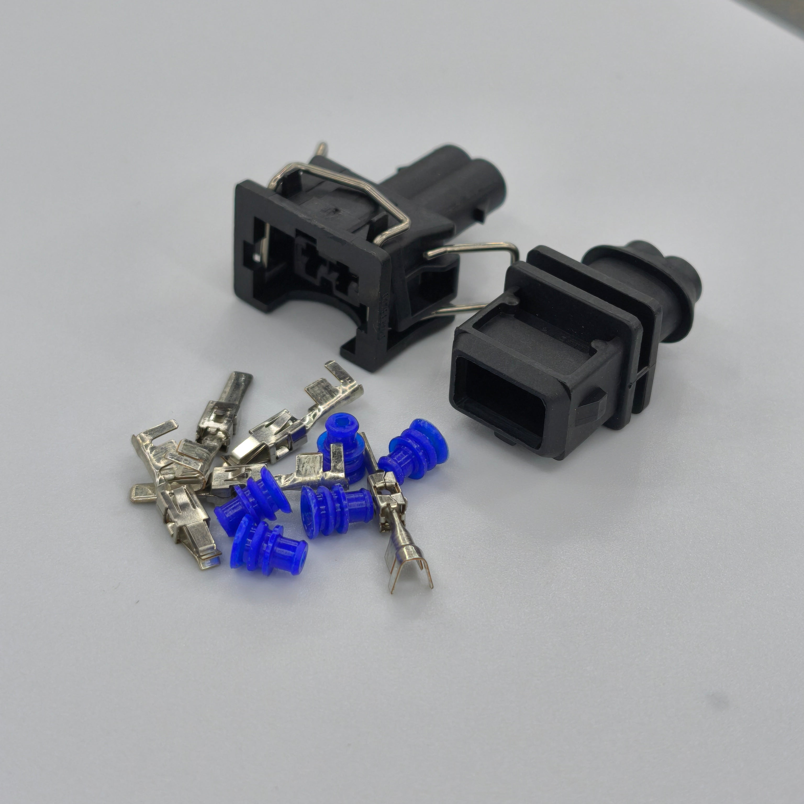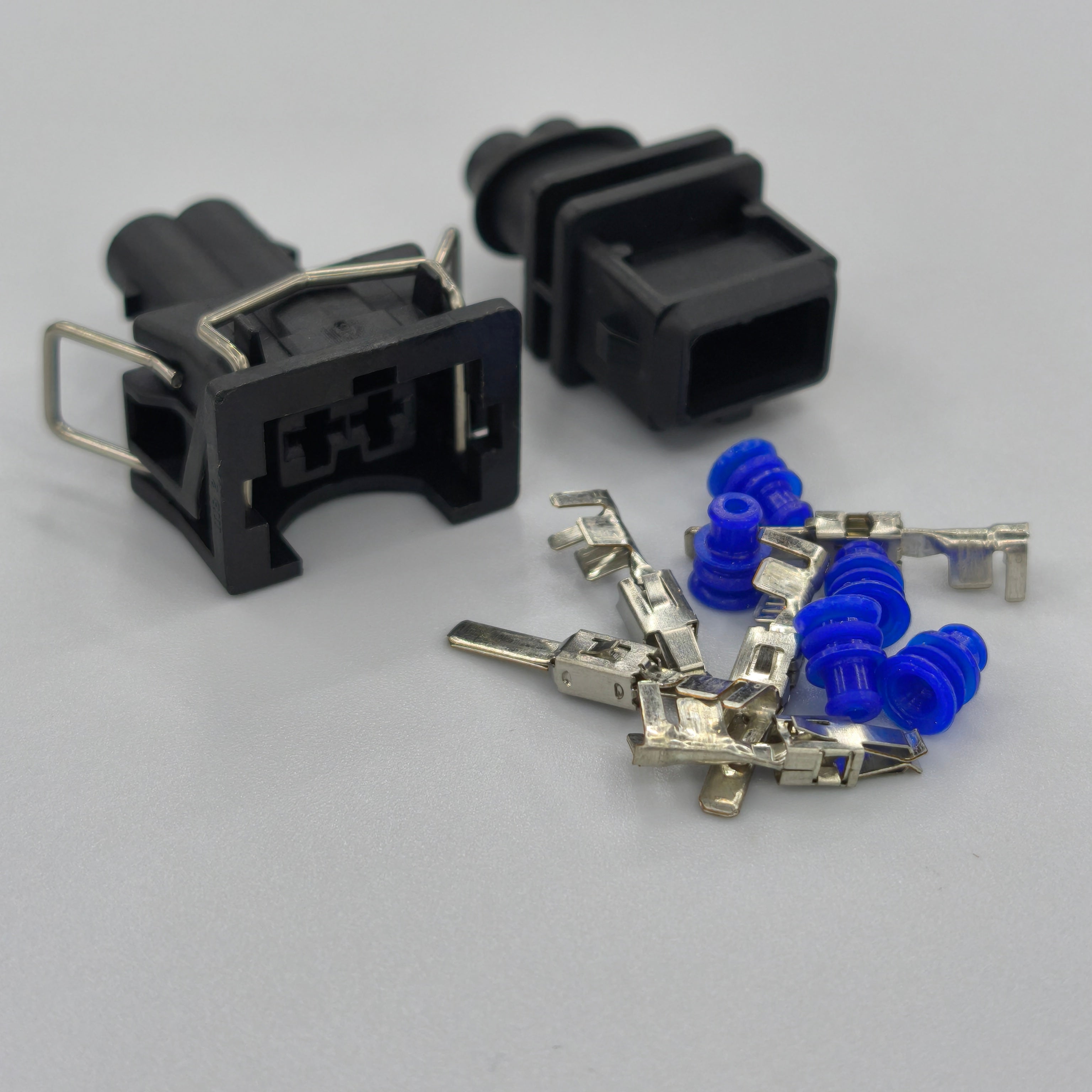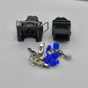 Replacement 2 pin EV1 fuel injector connector kit designed for wiring loom repairs and custom injector wiring builds. This set includes both the male and female connector housings for a secure sealed connection.